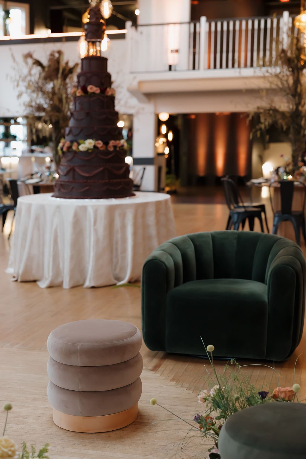 The showstopper was the nine-foot cake. Yes, you read that right—a nine-foot tall cake stood in the center of the space like an art installation. This wasn’t just dessert; it was a statement. Rather than a traditional all-white cake, we leaned into the earthy, retro aesthetic with dark chocolate frosting. The design featured ten tiers of cake, two tiers of florals, and vintage-inspired pillars that echoed classic 70s grandeur.